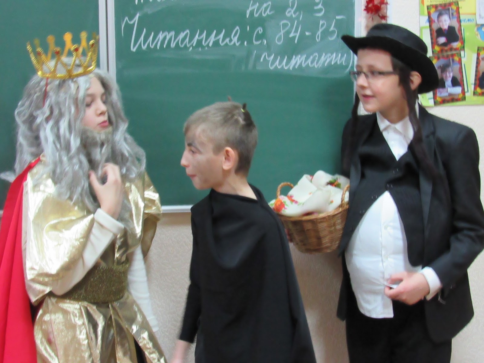 С девяти утра наши "Ряженые" (ученики 5-6 классов) ходили по учебным кабинетам и приглашали ребят, учителей и все службы нашего учебного заведения на свое Новогодние представление под названием "Волшебный напиток"написанное Михаэлем Энде.